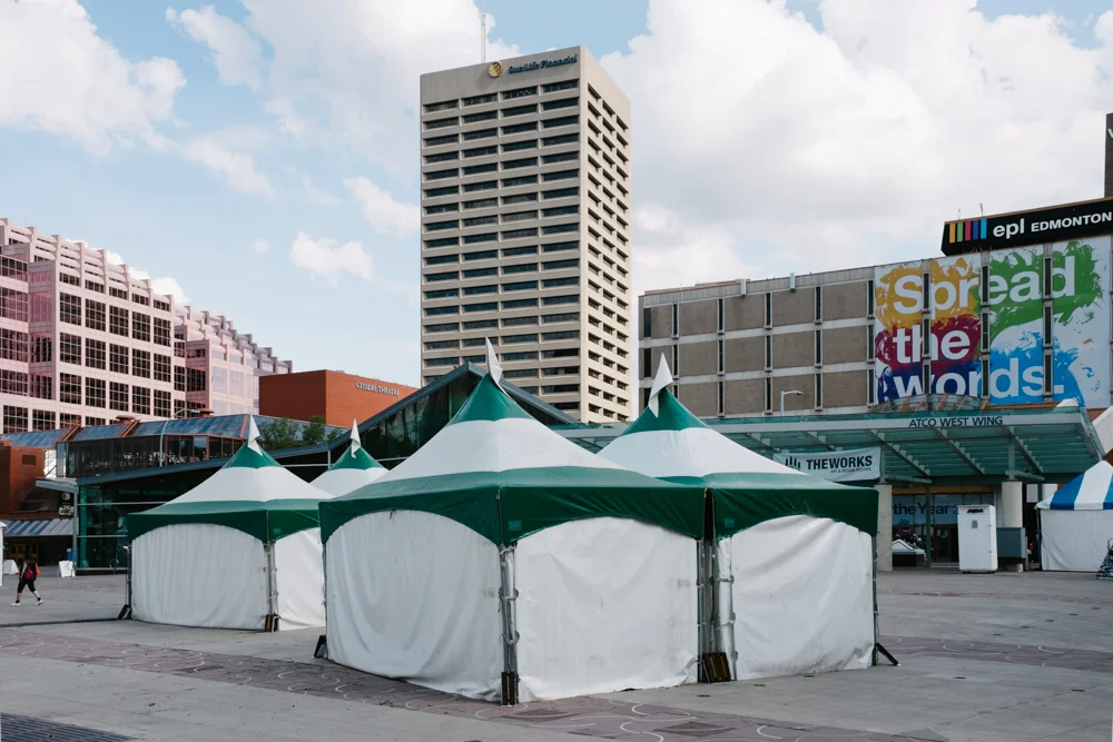 Edmonton is often lauded as a 'festival city' and while that is definitely true (moreso in the summer) and it does bring vibrancy to our city's core, I sometimes lament the fact that without these festivals to give reason for everyday people who wouldn't otherwise go downtown to go, the core can be rather empty (outside usual business hours), as the photo below shows with festival tents all closed off. It's as if Edmonton is a city of temporary vibrancy, veiled in the tents and buskers of summer's past. Now, this is slowly changing, but I know for a fact Churchill Square is never busier than when it has a big festival going on.
